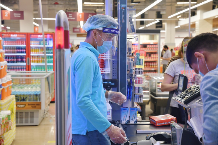 У кассиров в супермаркетах двойная защита на лице: маска и пластиковый экран. А еще шапочка и перчатки.
