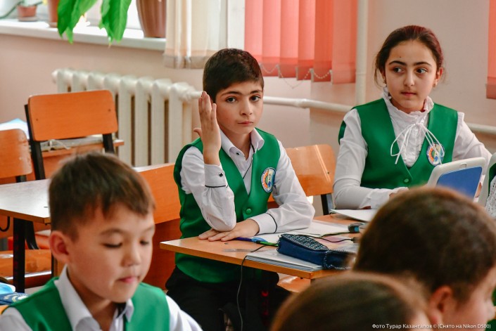 В другом классе дети постарше смотрят ролик про Президента, а потом читают стихи. По всей видимости, для них разговоры о Главе государства - привычное дело.