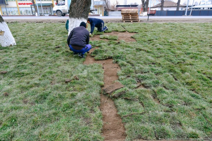 Разрезанную на квадраты траву они ловко укладывают на подготовленную почву.