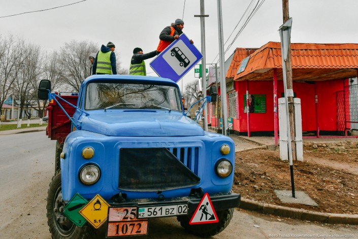 Рабочие устанавливали новые столбы и дорожные знаки.
