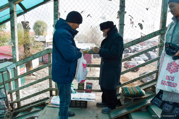 Шамши Палуанович продает книги на надземном переходе с 09.30-10.00 утра. После обеда он возвращается домой.