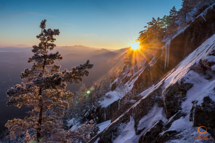 Куат Телегенов сделал этот кадр зимой 2017 года во время восхождения на Бурабай. Закатное солнце очерчивает силуэты гор, пронизывает снежные лапы хвойных деревьев и рисует неповторимую картину чего-то невероятно теплого среди зимней стужи. Использование приемов плановой перспективы, когда на картине есть несколько удаленных деталей и все они интересны сами по себе и открывают новые детали, только обогащает работу Куата.