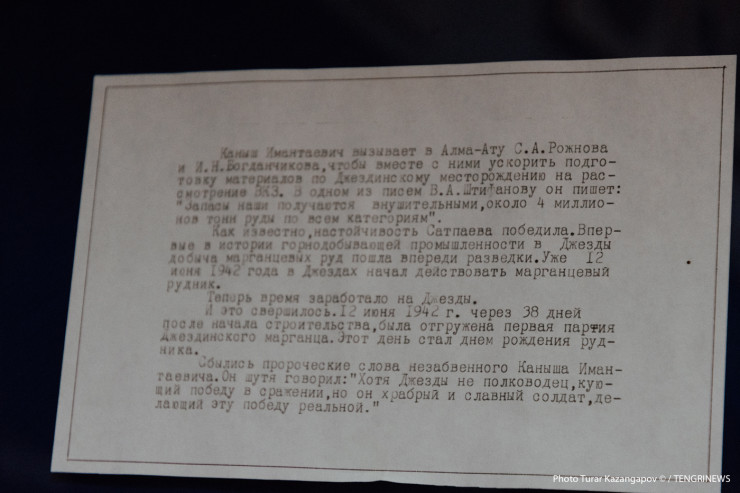 "За 38 дней здесь открыли марганцевое месторождение. Почему его открыли? Когда Гитлер напал на Советский Союз, надо было где-то марганец добывать, который был необходим для брони. Существующие советские месторождения марганца Гитлер захватил. Тогда Сталин дал указ, и Каныш Имантаевич Сатпаев всего за месяц и одну неделю открыл здесь рудник", - рассказывает Надежда Михайловна.