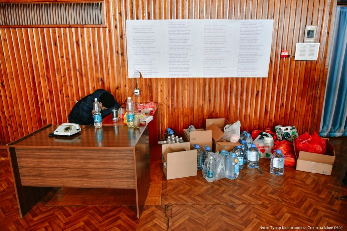Шахтеры окружают нас и за считанные минуты мы оказываемся в самом здании. Первого, кого мы увидели в актовом зале - уставшего шахтера, дежурившего возле стационарного телефона. Уже потом нам станет ясно, что этот советский аппарат - самая ценная вещь в эти дни. Но об этом немного позже.