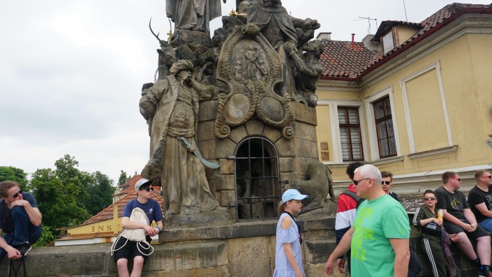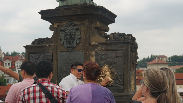 Люди то и дело потирают какую-нибудь фигурку и загадывают желание. Как объясняют гиды, на мосту есть лишь одно место, на котором можно загадать любое нематериальное желание. Это место, откуда сбросили в реку тело святого мученика Яна Непомуцкого в конце XIV века.