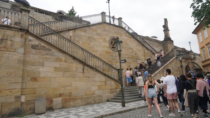 В этом же районе нас провожают к лестнице, на которой снимались сцены фильма  "Миссия невыполнима -1" с Томом Крузом. По этой лестнице он съезжал на мотоцикле, а потом оказывался на набережной Влтавы.
