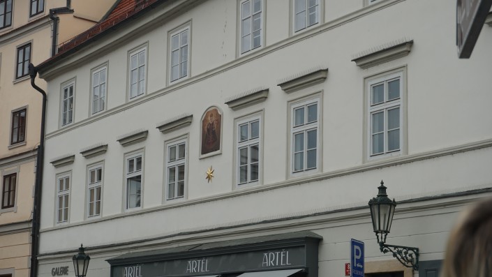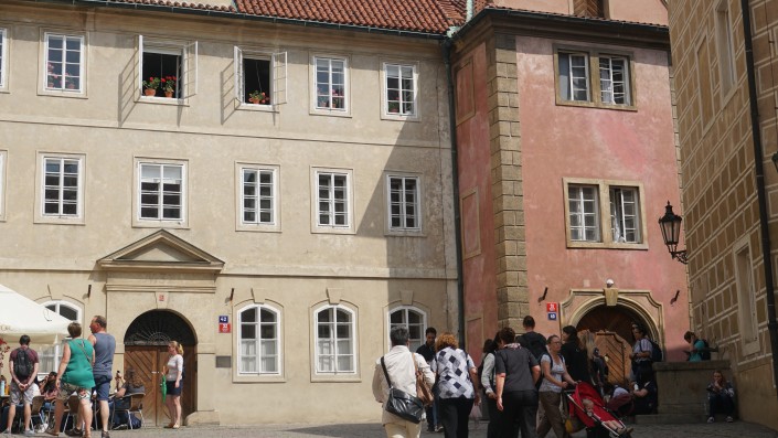На площади перед старым королевским дворцом расположены дворцы влиятельных господ. Первоначально в них была расселена прислуга королей, но после частых пожаров знатных граждан переселили на площадь. К примеру, этот дворец принадлежал Шварценбергам.