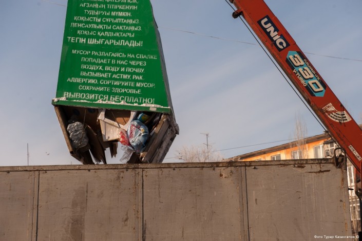 "Дизайн и форма наших контейнеров не позволяет содержимому при сильном ветре разлетаться по дворам. Решили немного креативнее подойти: глаза, руки нарисовали, написали "Накорми меня". Чтобы люди запоминали, чтобы их мотивировать сортировать мусор", - делится директор ТОО "ТТК" Еркин Мукаев. В "мусорном" бизнесе он работает уже долгое время. Больше всего усилий компания вкладывает в пропаганду раздельной сортировки мусора самими жителями.