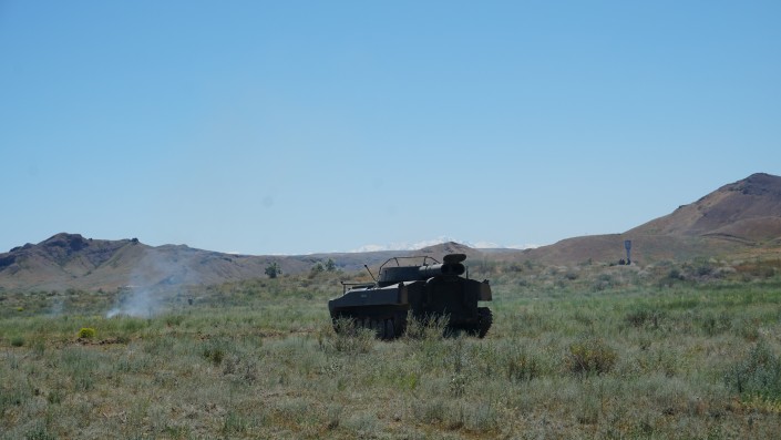 Напоследок смотрим, как работает установка разминирования полей. По словам военных, разминирование осуществляется с помощью ударной волны от заряда, который выстреливает на дальность около 250 метров и вызывает детонацию заложенных предметов. Поэтому установку разминирования называют еще "Змеем Горынычем" - за два языка пламени, которые образуются во время выстрела.