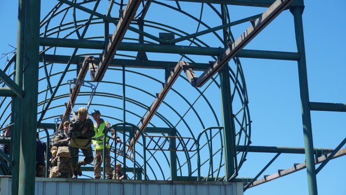 Этот тренажер называют вышкой. Военнослужащие подвешиваются и отрабатывают на нем упражнения и действия в воздухе до приземления.