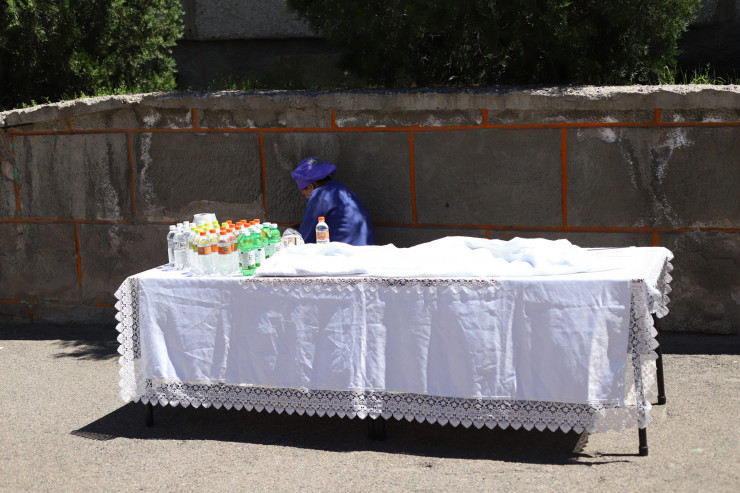 День в Алматы выдался жаркий. Возле некоторых участков были выставлены прилавки с соками и водой. Однако, к разочарованию избирателей, вода была небесплатной. А интереса брать за деньги у людей особо не было. Поэтому продавцы явно скучали.