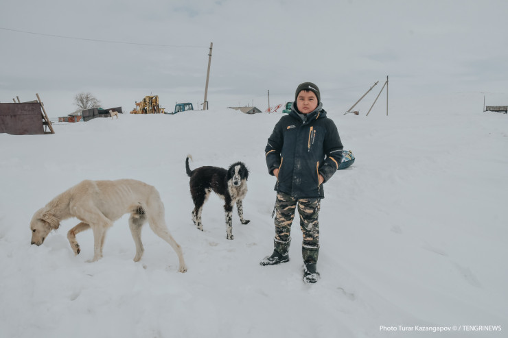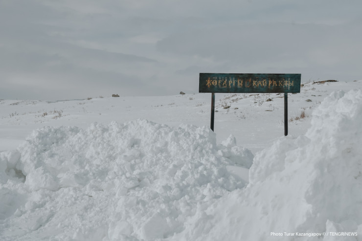 Эти кадры мы снимали в последних числах марта, и когда в соседних селах уже все начинало таять, здесь, в сопках, где расположен Верхние Кайракты, все еще была снежная зима. К этажному микрорайону мы так и не смогли подобраться поближе из-за сугробов, дороги туда не было, зато была захудалая дорога к частному сектору.