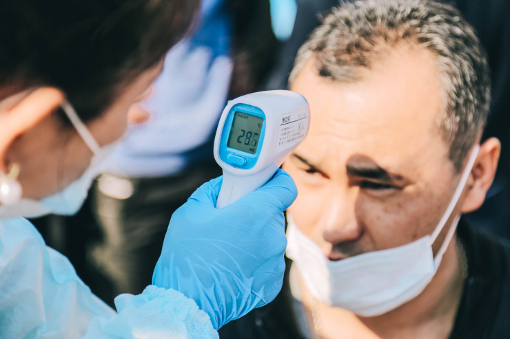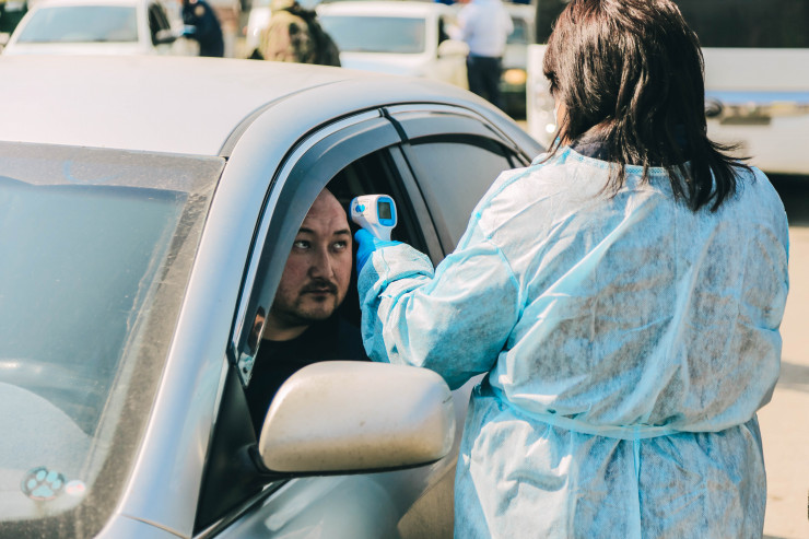Санитарные врачи измеряют всем температуру.