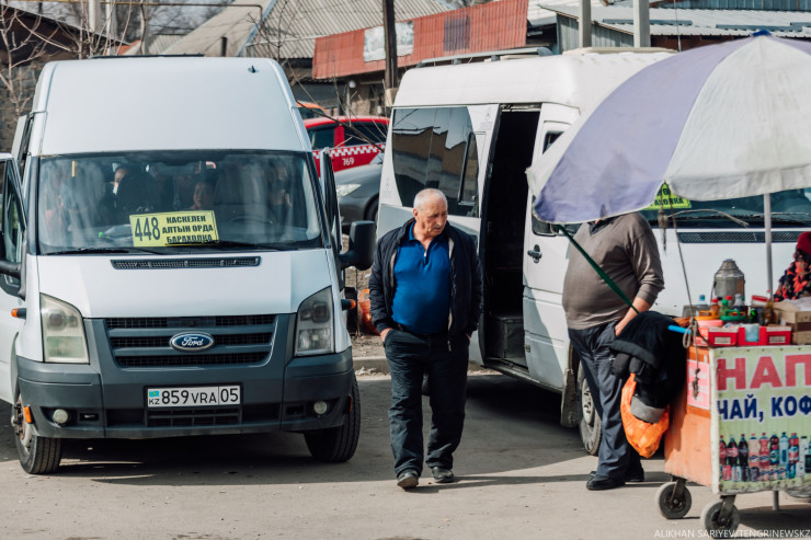 Подходим к месту, где кучкуются таксисты. Знакомимся с одним из них, его зовут Сарап, на этом пятачке он работает больше 30 лет, можно сказать, местная легенда. Ездит по маршруту Барахолка - Каскелен, в день, если повезет, совершает два рейса. "Я всю жизнь работаю шофером, а здесь начинал, когда еще барахолка только-только появилась. Работа вообще интересная, с кем-то и поругаешься, с кем-то подружишься, дорогая долгая, одни говорят, быстро не езжай, другие, давай быстрей, не останавливайся, оттуда уже еду пустым".