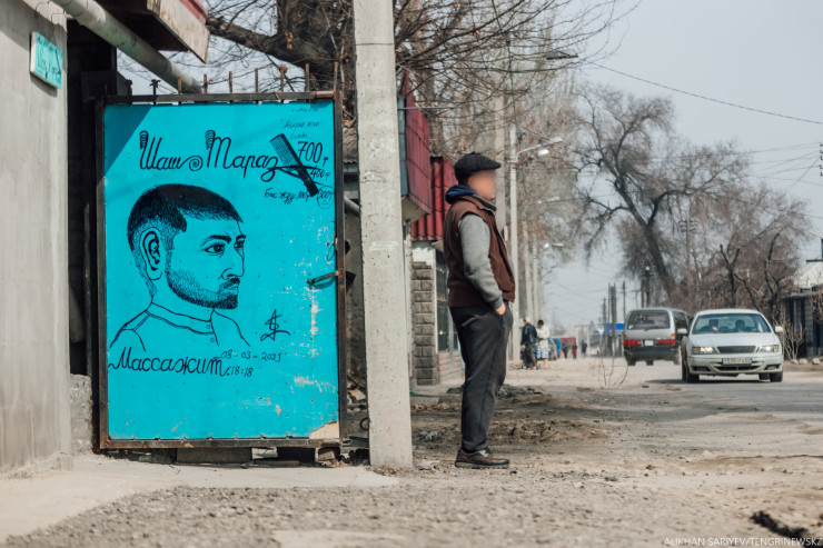Здесь мы знакомимся с нашим первым героем. Он как раз в этот момент вышел на улицу, видимо, зазывать клиентов. Мужчина соглашается пообщаться с нами, а вот лицо просит не показывать. Маулен переехал сюда 15 лет назад из Китая, там работал на базаре, зарабатывал до двух тысяч юаней в месяц (по курсу тех лет это около 35 тысяч тенге). Говорит, что любит Казахстан, здесь у него своя парикмахерская, но клиентов уже год как нет. Хотя, на наш взгляд, вывеска у него вполне креативная.