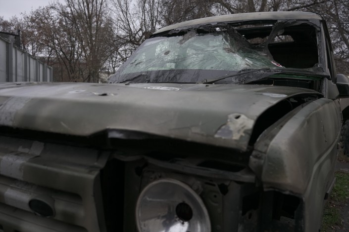 Он обращает наше внимание на джипы с самодельной броней.