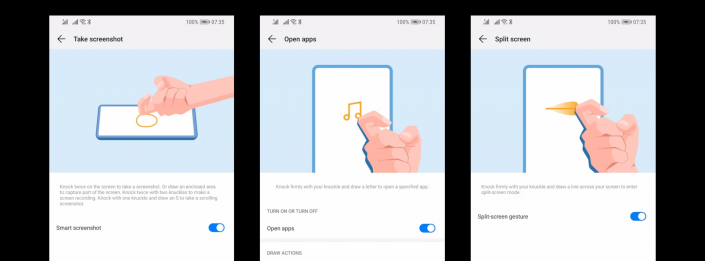 Кроме того, в EMUI 9.0 реализован режим быстрых действий по стуку костяшек пальцев. Например, двойным стуком можно сделать скриншот. Если же сделать это двумя пальцами, запустится режим записи экрана.