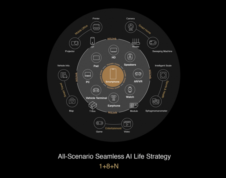 Быстрое переключение на разных девайсах. AppGallery является частью собственной мобильной экосистемы Huawei "1+8+N". Концепция 1+8+N предполагает, что основной гаджет пользователя – смартфон (1). Вокруг него строится взаимодействие с другими устройствами: ноутбуком, планшетом, умными часами, наушниками, колонками, телевизорами, умными очками и системами для автомобилей (8). Буква N символизирует интернет вещей или бессчетное количество бытовых устройств, собирающихся в один умный дом. Все это взаимодействует между собой на единой платформе и управляется со смартфона.