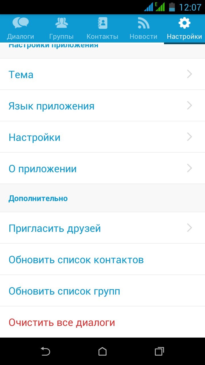 В меню настроек можно выбрать тему - синюю или оранжевую. В верхней части экрана расположены разделы, они стандартные, за исключением рубрики "Новости". К примеру, 2 апреля разработчики напомнили, что в этот день в 1993 году были образованы Военно-морские силы Казахстана. Примечательно, что в меню можно очистить все диалоги (или настроить автоматическую очистку в заданный период времени) и обновить список групп и контактов - это будет полезно при поиске друзей, которые недавно установили iTys.