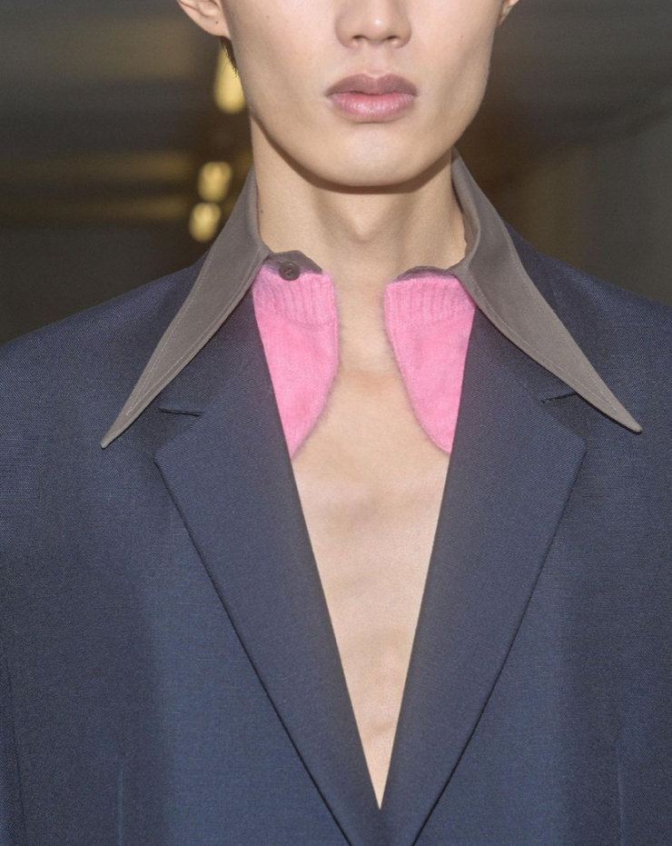 Новая работа Миуччи Прады и Рафа Симонса – математически выверенные пропорции привычных вещей. Пальто сужаются, словно футляры, которые защищают тело, бомберы укорачиваются и надуваются. К пиджакам крепятся заостренные воротники контрастных фактур и цветов. Выглядит, словно под пиджаком рубашка и кардиган, но там лишь голый торс.