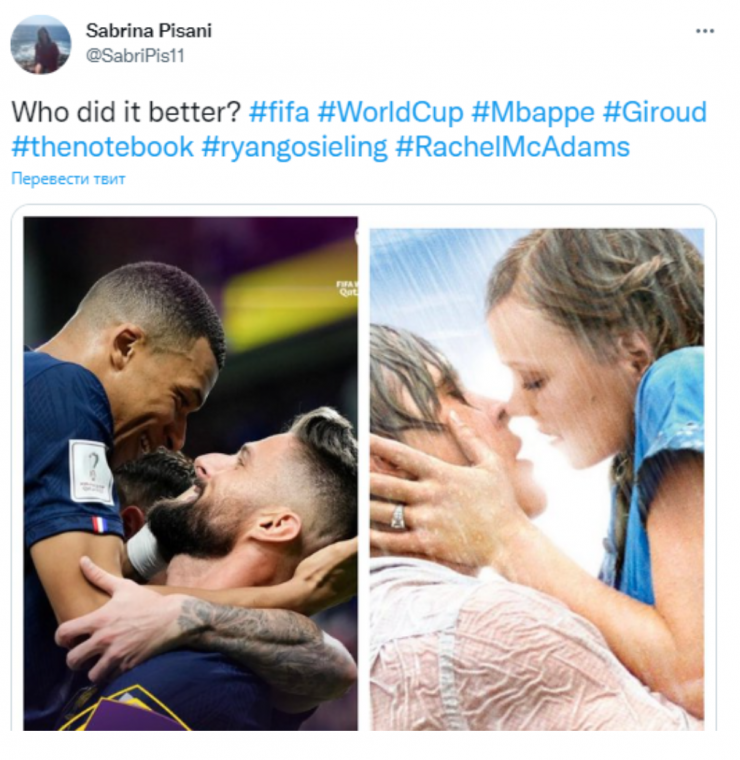 Самый популярный снимок ЧМ – фото обнимающихся футболистов сборной Франции. Мбаппе и Жиру отметили взятие ворот вместе: Килиан запрыгнул к Оливье на руки и ласково потрепал за голову. В Twitter пользователи эту связку сравнили с парой Райана Гослинга и Рэйчел Макадамс из фильма "Дневник памяти".