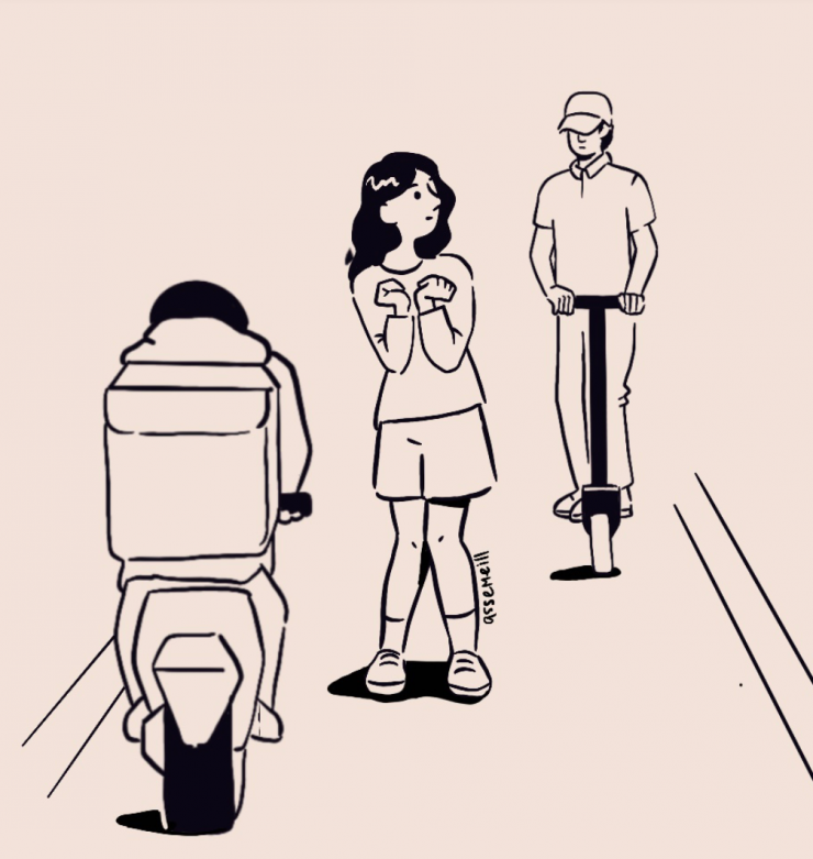 Также нередко алматинские пешеходы негодуют из-за водителей мопедов и самокатов. Совсем недавно были приняты поправки в связи с участившимися нарушениями дорожных правил. Однако одна иллюстрация описала целиком "боль" людей, прогуливающихся по тротуару.