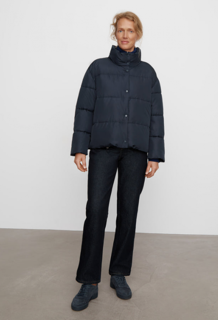 Зимний гардероб у большинства состоит из темных вещей. Действительно, белоснежный тотал-лук в грязь и сырость – не самое практичное решение. Поэтому короткий и темный пуховик отличный вариант для базового решения. Более того, его можно сочетать с любым образом: с расслабленными спортивными штанами, строгими брюками и джинсами.