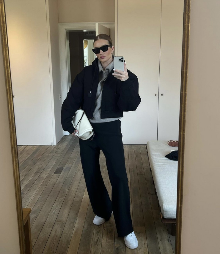 Хит последнего полугодия, брюки карго, модель сочетает с базовым белым топом, накинув поверх шерстяной свитер. Примечательно, что Рози выбрала брюки без главного элемента - накладных карманов, отдав предпочтение завязкам на щиколотке. Ключевую роль в образе играют аксессуары - массивная сумка и очки-авиаторы, вторящие цвету брюк, но в более глубоком оттенке.