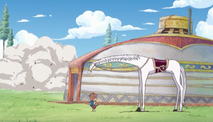 В аниме под названием "One Piece. Большой куш" были замечены юрта, аксакал, лошадь и охотничья собака. Конечно же, все это отсылает к образу кочевника и казахской айдентике.