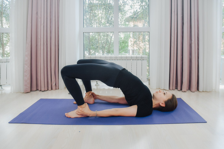 Стопы и ладони расставлены на ширине плеч и таза, хорошо отталкиваемся ладонями от пола и вес тела также равномерно распределяем на стопы и ладони. Если есть противопоказания - грыжи и протрузии, делаем только позу полумоста.