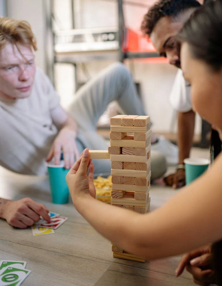 Легкая, но не менее увлекательная игра "Дженга" также рассчитана на компанию любого возраста. От участников требуется построить башню высотой в 18 этажей. Главное правило – извлекать блоки и переставлять их на верх башни так, чтобы чтобы конструкция не рухнула.