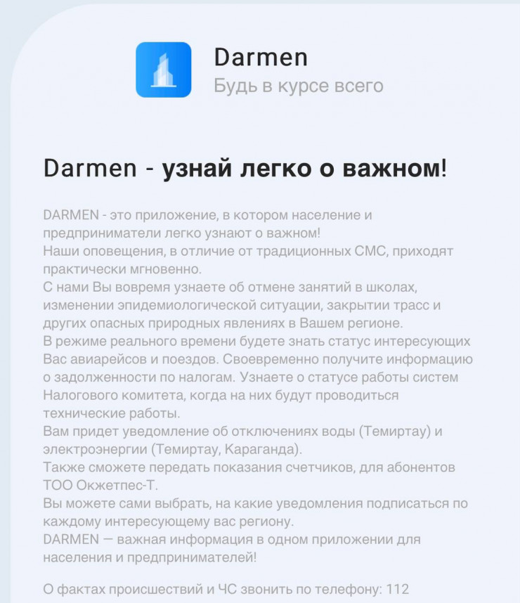 По словам начальника центра управления в кризисных ситуациях МЧС Казахстана Айбола Акпарова, после получения информации от сейсмологов о ЧС, в том числе о землетрясениях, казахстанцам в течение нескольких секунд приходят уведомления на телефоны, в которых установлено мобильное приложение.