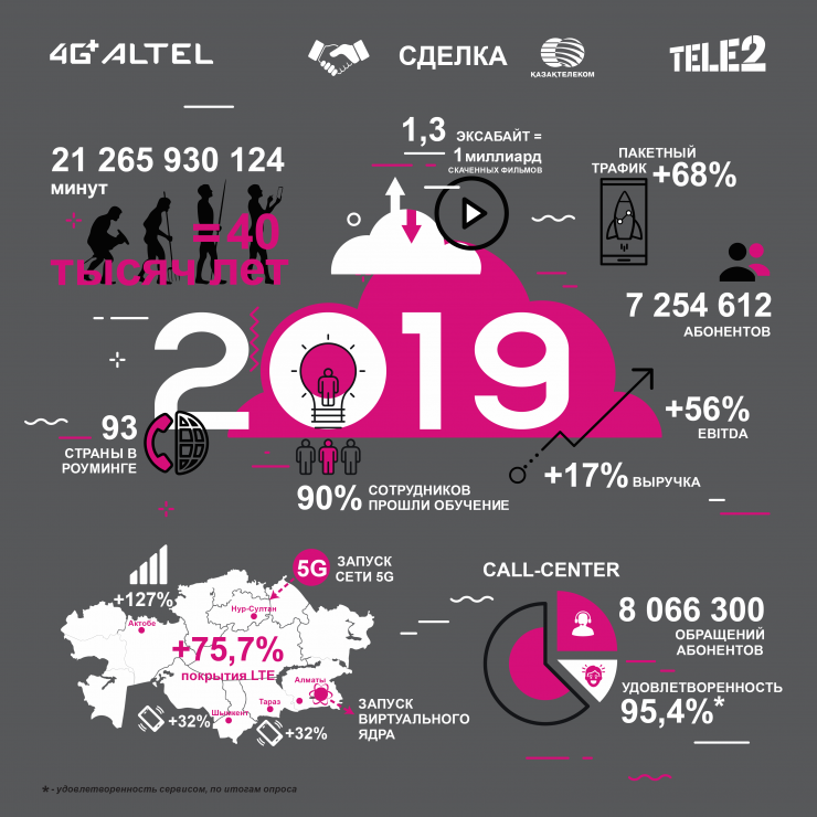 Ключевым событием прошедшего года для компании стало завершение сделки по покупке АО "Казахтелеком" 49 процентов акций Khan Tengri Holding B.V. в СП "Tele2 Altel". По итогам крупнейшей сделки на казахстанском рынке телекома в 2019 году ведущий инфокоммуникационный оператор Республики Казахстан получил 100-процентный контроль в ТОО "Мобайл Телеком-Сервис".