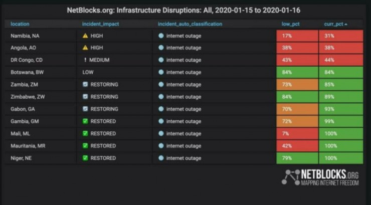 Отключения интернета зафиксированы в Республике Конго, Демократической Республике Конго, Намибии и Анголе. Суммарное население стран превышает 120 миллионов человек. При этом государства, вероятно, не остались в полной изоляции от интернета: у них есть возможность использовать сеть с помощью спутникового соединения и наземных кабелей.