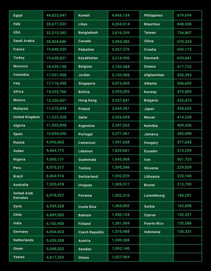 Большая часть телефонных номеров принадлежит гражданам Египта (45 миллионов), Италии (35 миллионов), Саудовской Аравии (29 миллионов), Франции (20 миллионов) и Турции (20 миллионов). В списке значатся и пользователи из Казахстана - их 3 миллиона 214 тысяч 990.