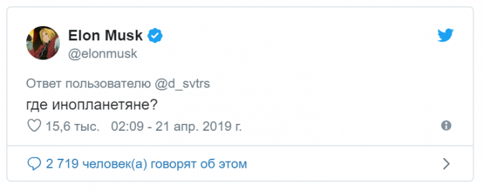 В субботу один из пользователей по-русски адресовал Маску вопрос о том, не осваивает ли он космос для того, чтобы привезти на Землю инопланетян. "Где инопланетяне?" - ответил Маск на русском языке.