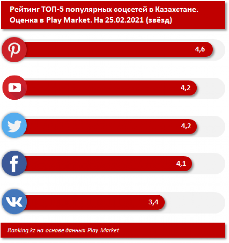 По данным магазина приложений Play Market, пользователи Pinterest по всему миру оценили приложение на 4,6 звезды из 5. Следом идут YouTube и Twitter - 4,2 звезды из 5. Facebook оценили на 4,1 звезды, "ВКонтакте" - на 3,4.