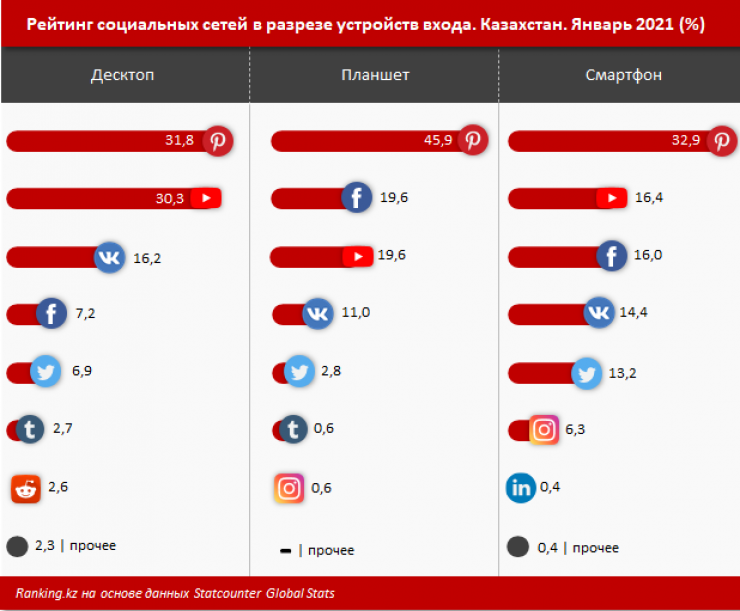 С настольных устройств - компьютеров, ноутбуков или моноблоков - пользователи в Казахстане чаще всего посещают Pinterest, YouTube и "ВКонтакте".