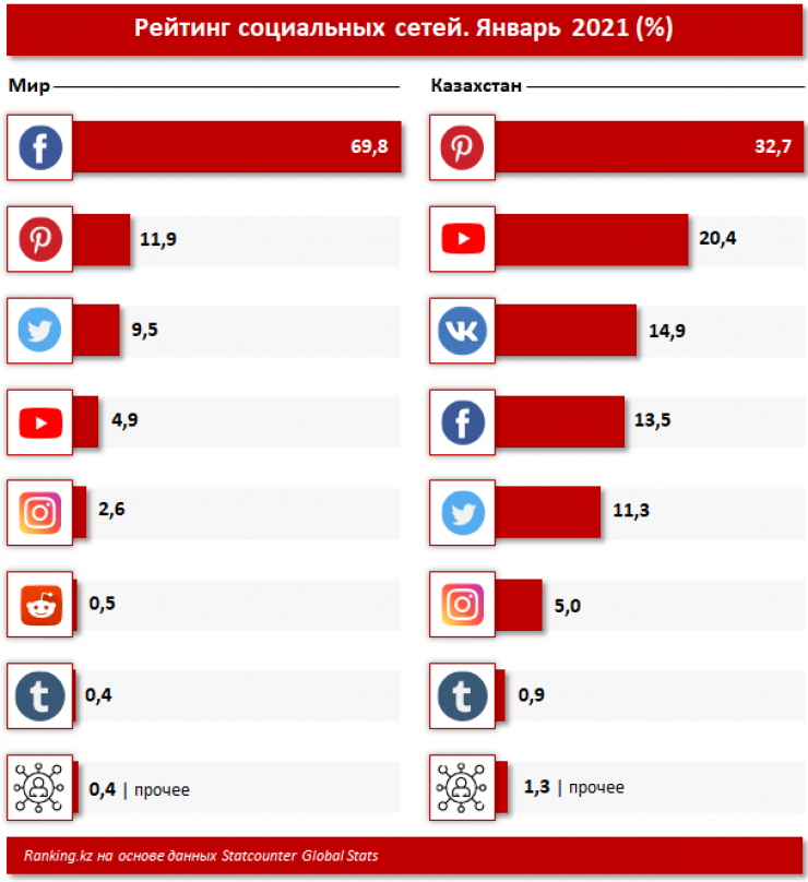 В январе 2021 года самой популярной социальной сетью в мире, по данным Statcounter Global Stats, стала сеть Facebook, чья доля составила 69,8 процента. Следом идут Pinterest (11,9 процента), Twitter (9,5 процента), YouTube (4,9 процента) и Instagram (2,6 процента).