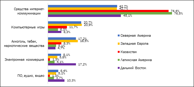 Так, в странах Западной Европы и Северной Америки около 43 процентов детей пользуются средствами интернет-коммуникации (социальными сетями, веб-почтой, чатами и так далее). В Казахстане же этот показатель в полтора раза выше - 74 процента. "И эти цифры, возможно, говорят не столько о низком интересе детей из западных стран к соцсетям, сколько о небольшом распространении мобильных устройств и, следовательно, мобильных средств интернет-коммуникации среди казахстанских и латиноамериканских детей. Такая же ситуация, к слову, наблюдается и в России, где те же 74 процента детей проводят свое время за ПК в социальных сетях и чатах", - отметили аналитики.