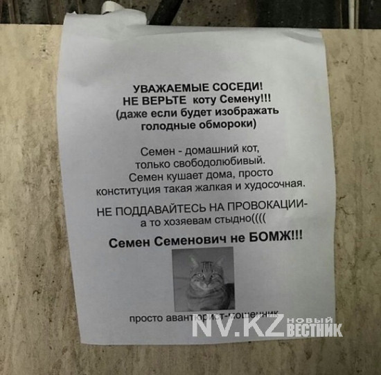 В социальных сетях опубликовали забавное фото, заснятое в одном из карагандинских подъездов. Хозяева "свободолюбивого" кота Семена с юмором рассказали соседям о его повадках. Карагандинцы просят соседей не верить их домашнему авантюристу, который прекрасно питается дома, но не упускает возможности клянчить еду у сердобольных соседей.