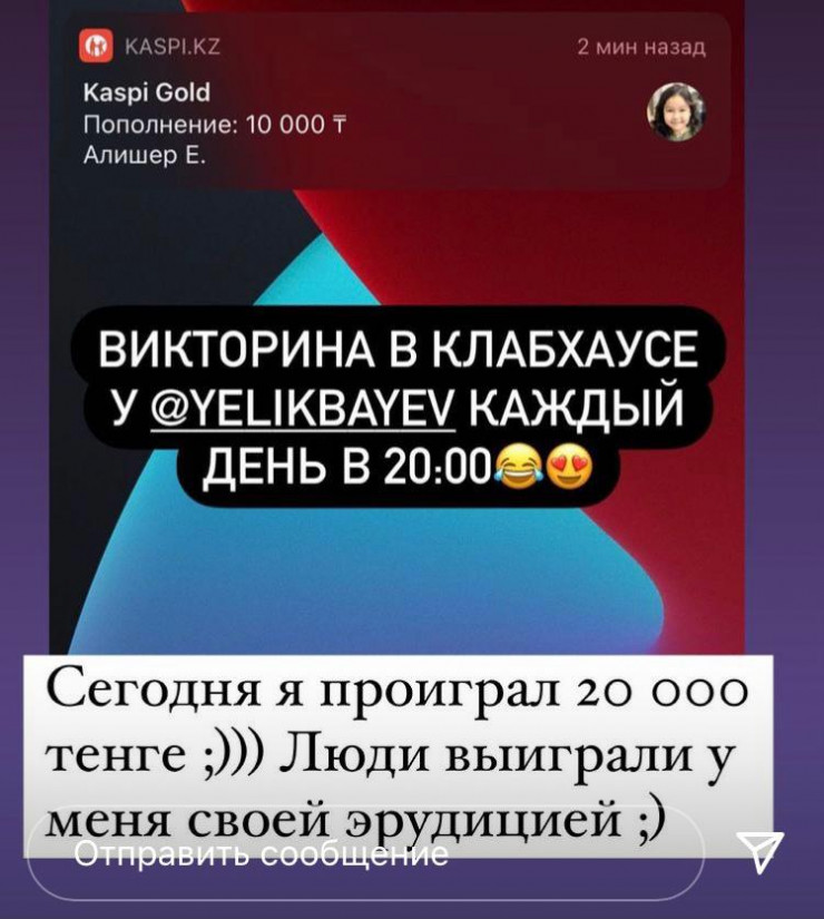 Также Сыдыкназаров предсказал, что Instagram-бизнесмены начнут активно монетизировать свое присутствие в Clubhouse. Пока мы заметили обратный эффект, например, блогер и PR-эксперт Алишер Еликбаев организовал в Clubhouse викторину с денежными призами, а анонсирует ее в Instagram.