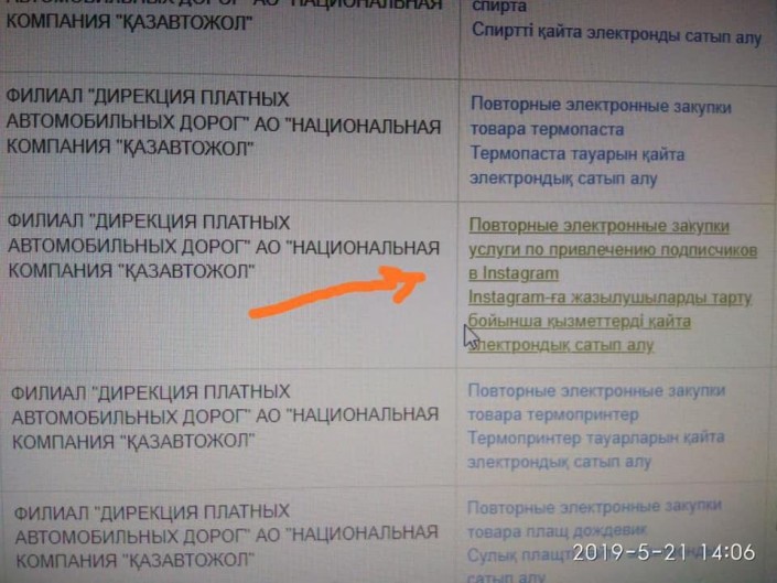 В социальных сетях появилась информация о том, что филиал "Дирекция платных автомобильных дорог" национальной компании "КазАвтоЖол" опубликовал лот на сайте государственных закупок по приобретению услуг раскрутки Instagram-аккаунта, передает корреспондент Tengrinews.kz.