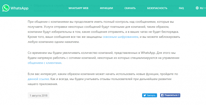 "Услуги отправки некоторых сообщений будут платными для компаний, таким образом, компании будут избирательны в том, какие сообщения отправлять, а в ваших чатах не будет беспорядка. Кроме того, ваши сообщения все так же защищены сквозным шифрованием, и вы можете заблокировать любую компанию одним нажатием", - отметили в WhatsApp.