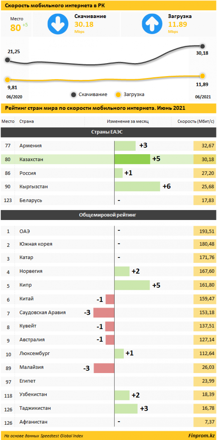 В результате количество измерений параметров SpeedTest в стране с осени 2020-го выросло десятикратно, а с нынешней весны скорость интернет-соединения начала увеличиваться прогрессирующими темпами, не снижающимися 4-й месяц подряд. В рейтинге стран по скорости мобильного интернета в июне 2021-го Казахстан занял 80-е место, улучшив позиции за месяц на 5 пунктов, а за год — сразу на 15. Среди стран ЕАЭС и Центральной Азии Казахстан сейчас является вторым после Армении, причем по темпам прироста опережает и это государство.