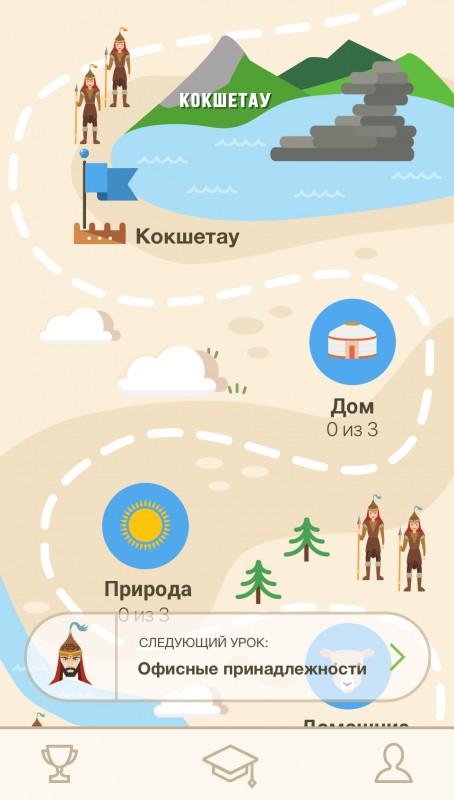 К примеру, приложение Qazaq App представлено в виде игры. Оно представляет собой путешествие батыра по городам Казахстана, где каждый город представляет собой главу урока. Проходя главу, батыр покоряет Казахстан, город за городом. В каждой главе содержится по три чаптера, в свою очередь состоящих из нескольких уроков. В каждом уроке представлены слова или фразы на казахском языке определенной тематики. Кроме перевода, практически к каждому слову прилагается ассоциативная картинка, которая поможет запомнить слово зрительно, а также транскрипция в виде озвучки — для усвоения правильного произношения. Каждый пройденный урок вознаграждает пользователя баллами-баурсаками. Доступен в App Store и Play Market.