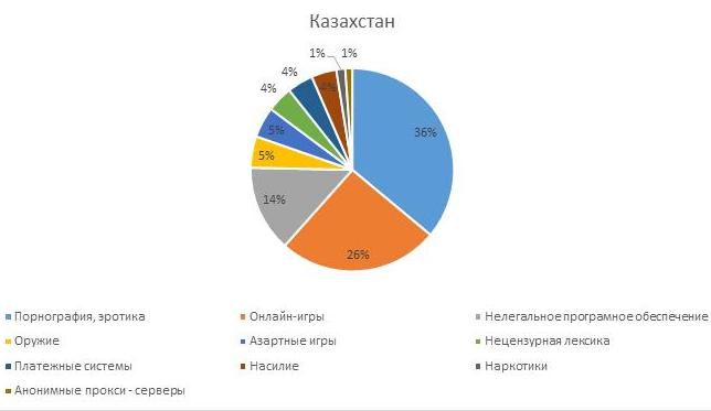 Отметим, что в Японии на долю порноресурсов приходится 74,9 процента сайтов с нежелательной информацией. В США высокий процент посещения сайтов показала категория "Насилие", в Мексике лидирют ресурсы категории "Наркотики". Также были выявлены любопытные зависимости. К примеру, уровень интереса к сайтам различных категорий меняется от страны к стране, однако при этом рост доли посещений сайтов категории "Насилие" сопровождается ростом посещений сайтов категории "Наркотики" и наоборот. Здесь стоит отметить, что в Казахстане популярность категорий "Насилие" и "Наркотики" минимальна, чего нельзя сказать о категории "Оружие".