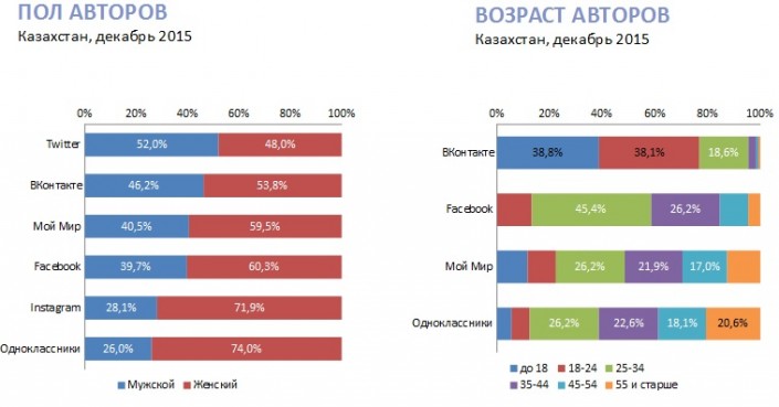 Добавим, что во время исследования были собраны и проиндексированы все публичные сообщения в социальных сетей на русском, казахском и других языках, а также данные их авторов. Для определения географии были взяты данные из профилей авторов, геометок сообщений. Пол и возраст был определен исходя из данных, указанных в профилях пользователей. Кроме того, данные о поле юзеров были дополнены информацией, полученной с помощью лингвистического анализа имен и фамилий авторов.
