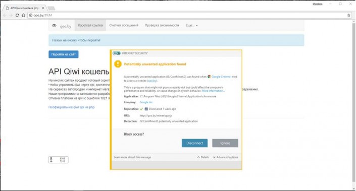 "Обычно Beeline KZ в рассылках использовала короткие через сайт bee.gg. В этот раз был использован сайт qoo.by (для схожести с goo.gl?) Чтобы развеять или подтвердить свои сомнения, я перешел по указанной ссылке https://qoo.by/3TcM используя браузер компьютера (открывать с осторожностью) и вуля! JS/CoinMiner.D [1] собственной персоной. Первая мысль была, что некие хитрые злоумышленники, используя подмену отправителя, искусно подделав схожесть рассылки с обычной рассылкой от "Билайн" решили заработать на доверчивости людей", - пишет он.