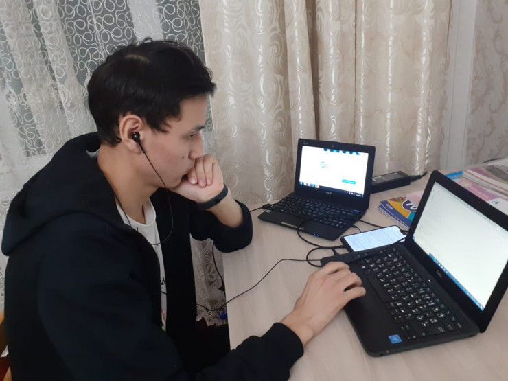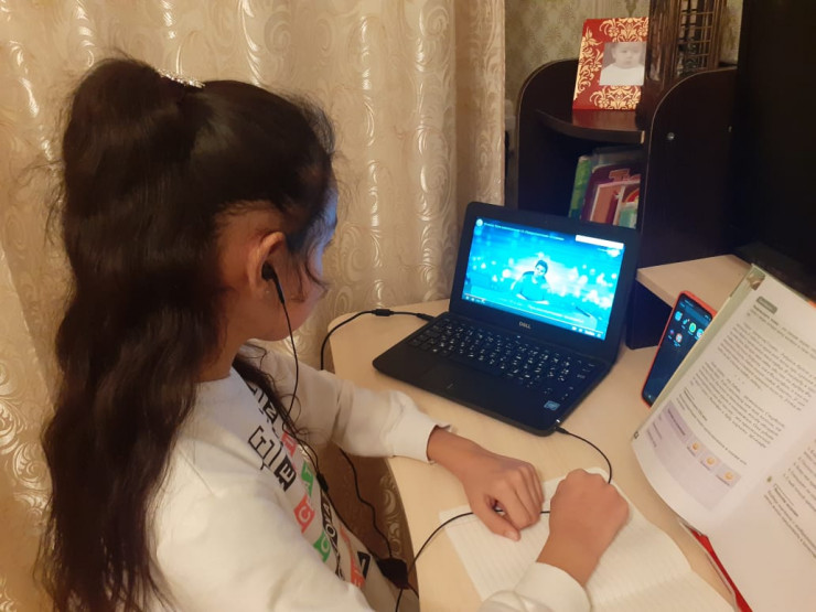Аружан, ученица 5-го класса из средней школы № 5 в селе Каргайлы на онлайн-уроке